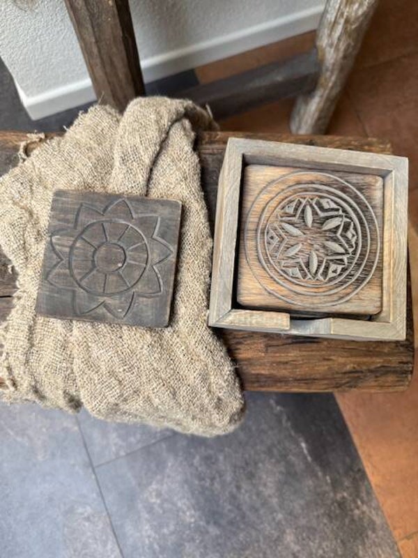 dit set bevat 6 houten onderzetter, in verschillende uitsijwerken.