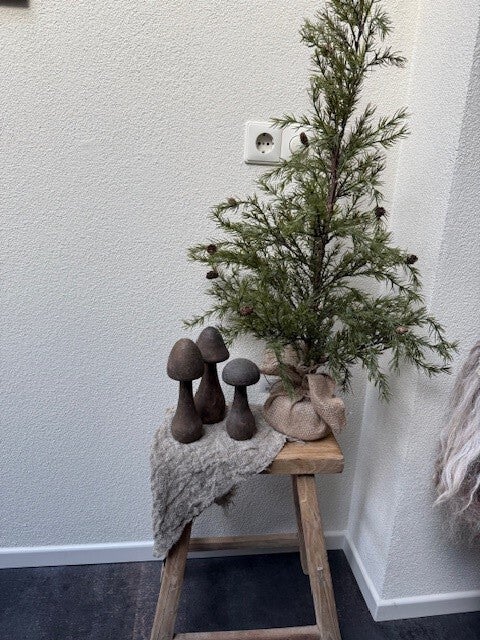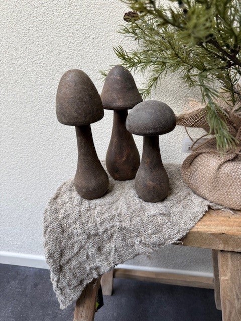Houten paddestoelen set, hout is altijd aan het krimpen en uitzetten dus kunnen altijd oneffenheden of scheurtjes bevatten.